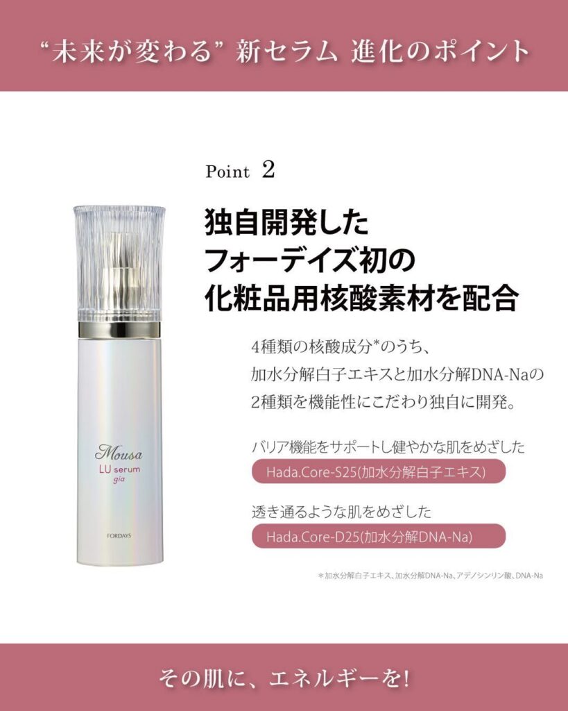 肌のエネルギーレベルに着目して独自開発したフォーデイズ初の化粧品用核酸素材Hada.Core-S25(加水分解白子エキス)とHada.Core-D25(加水分解DNA-Na)を新たに配合しました